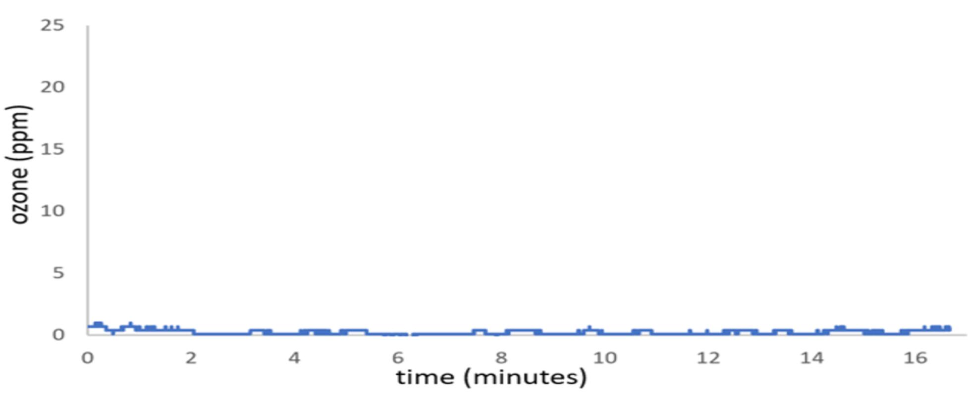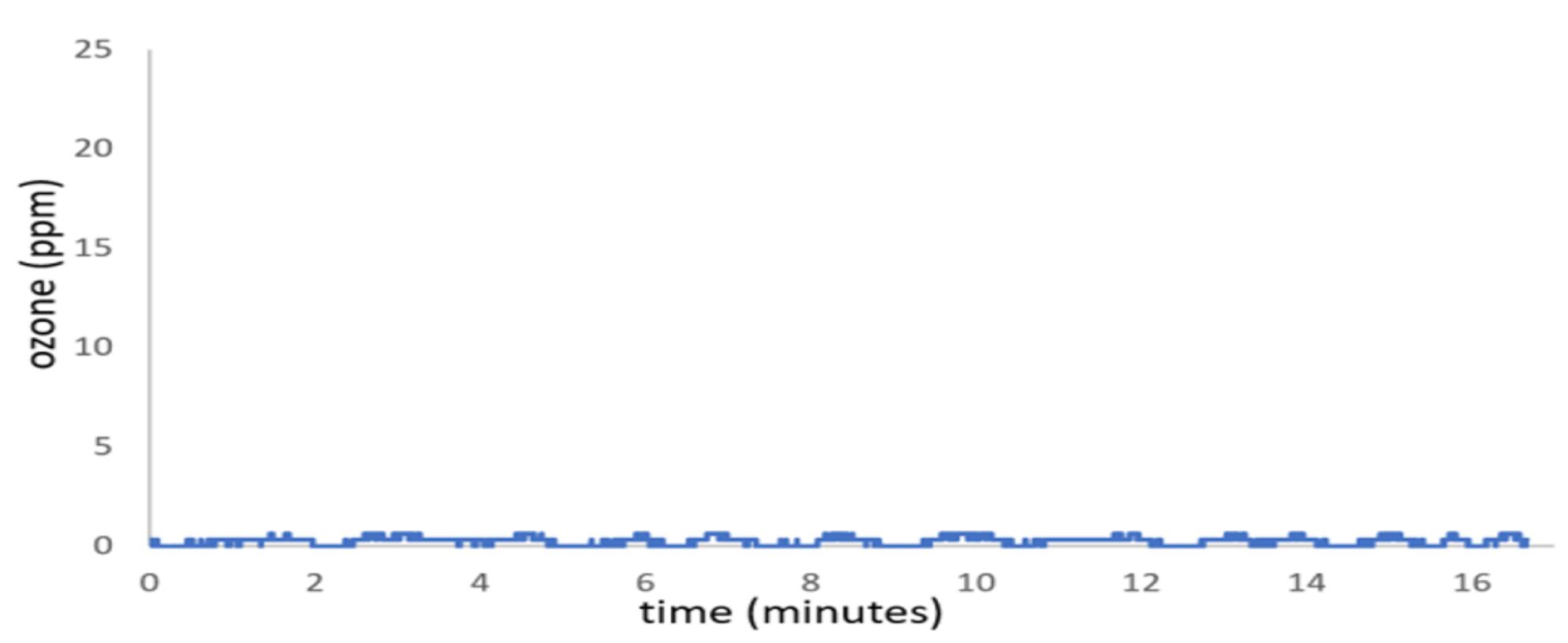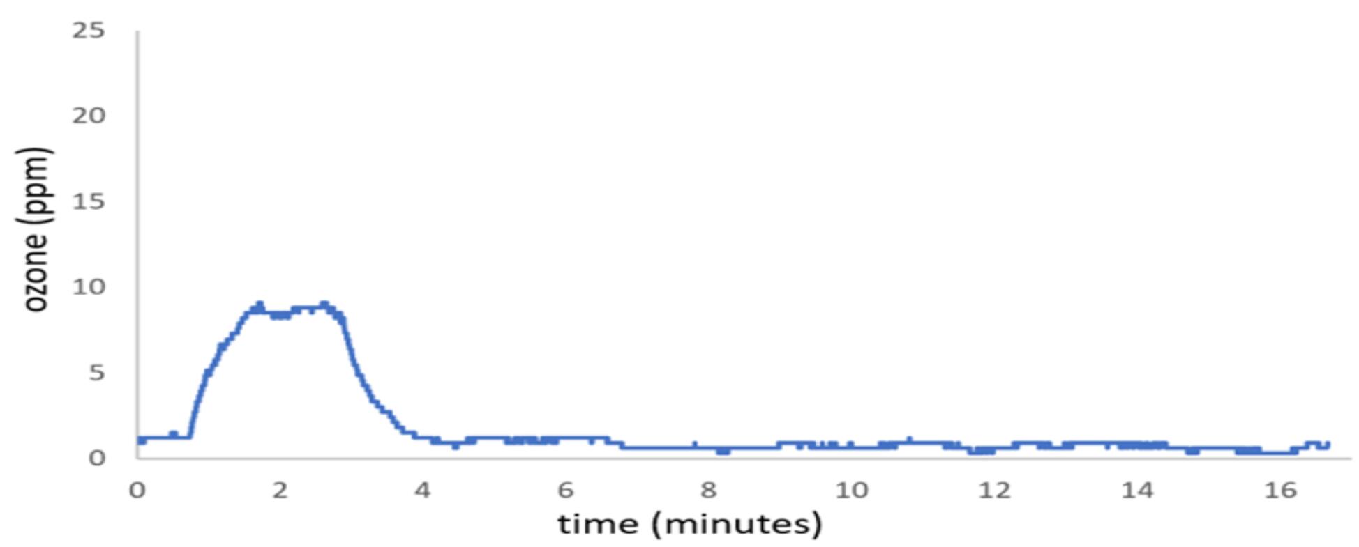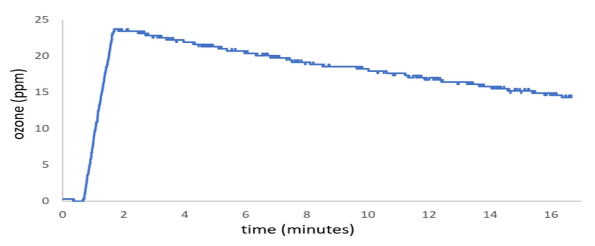 圖1.在一個24L 儲物盒中,在充滿和衰減期間,臭氧濃度隨時間變化的過程,蓋緊蓋子,并使用指定的臭氧鼓泡器產生600 mg / hr的臭氧。打開發生器電源后,臭氧濃度立即開始上升,并線性上升至大約24 ppm的水平,此時關閉了臭氧發生器電源,并使臭氧濃度下降。請注意,該盒子是空的,除了臭氧傳感器和一個混合風扇陣列已經經過大約10個臭氧充電周期。