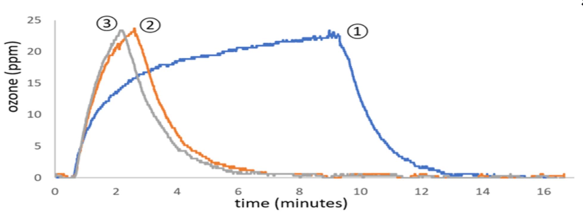 圖4.在盒子里裝臭氧淬火材料的影響。這將模擬一個使用骯臟和多孔材料的實際去污循環,也演示了“壁效應”,它減少臭氧的半衰期,因為它與表面(壁)接觸。臭氧盒裝220mm x 80mm x 160mm小紙板箱2個,總面積約為1300平方厘米,用過丁腈手套1副,用過N95口罩1副。將蓋子緊密貼合,使用指定為每小時產生600mg臭氧的臭氧鼓泡器進行凈化循環。第一次臭氧濃度充滿和衰變循環如圖所示(1)。第一次去污循環耗時近10分鐘,達到 很大臭氧濃度20ppm以上。去污箱蓋被移開,剩余的臭氧被吹出。蓋被換掉,緊接著是第二次(2),然后是第三次(3)凈化循環。這些項目沒有被移除,每個循環緊接在前一個循環之后。注意,臭氧充電時間減少與每個循環。這一結果清楚地表明,骯臟的、受污染的和表面積大的材料 很初將對臭氧產生強大的猝滅作用。在第一次去污后,臭氧的猝滅作用大大降低,在隨后的去污循環中減少的程度要小得多。教訓:當去污染的東西,或者很多東西的時候,去污染的時間要長,讓臭氧運行的時間也要長,而且要考慮去污染不止一個周期。
